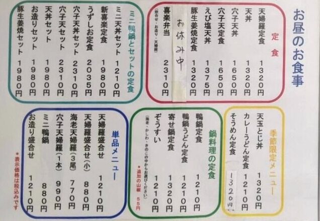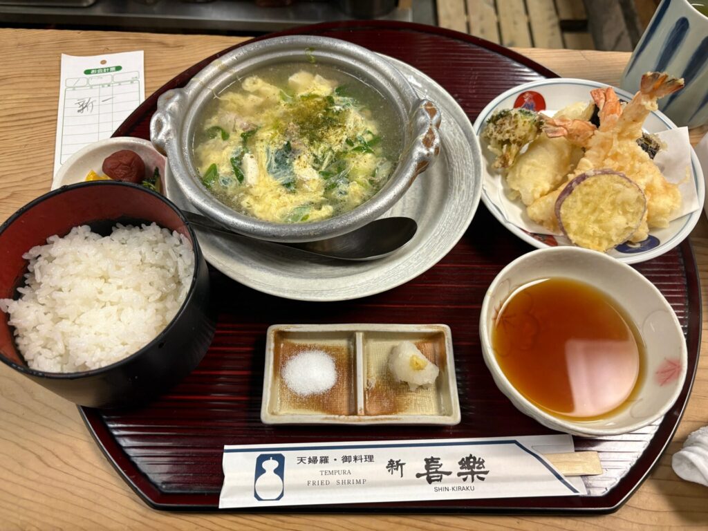 こちらは「天麩羅」と「鴨鍋」がセットになった定食で、新喜楽の料理が楽しめるオススメです!